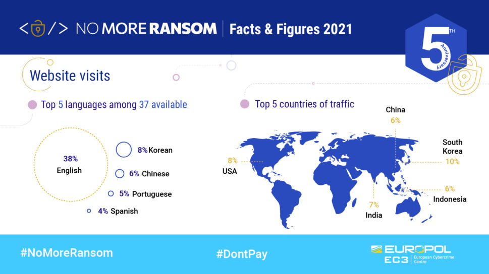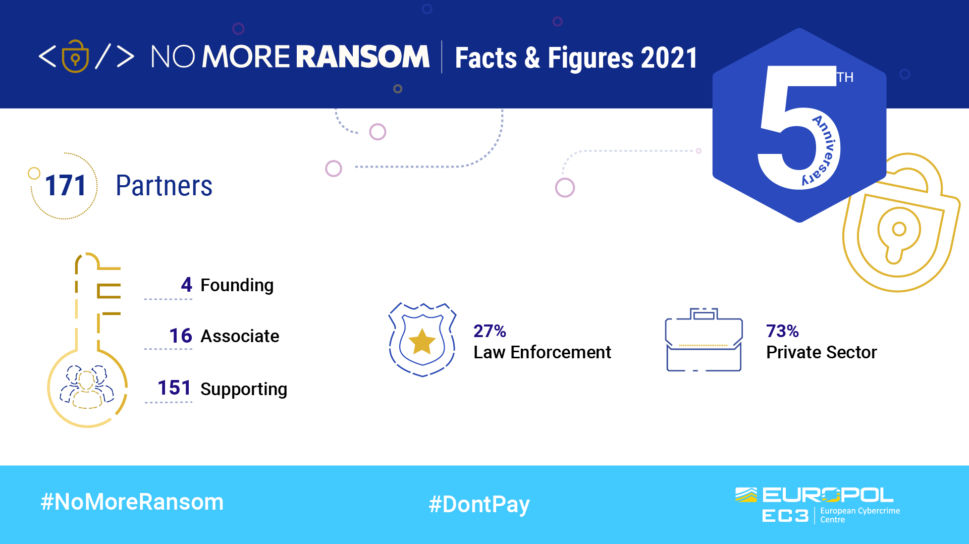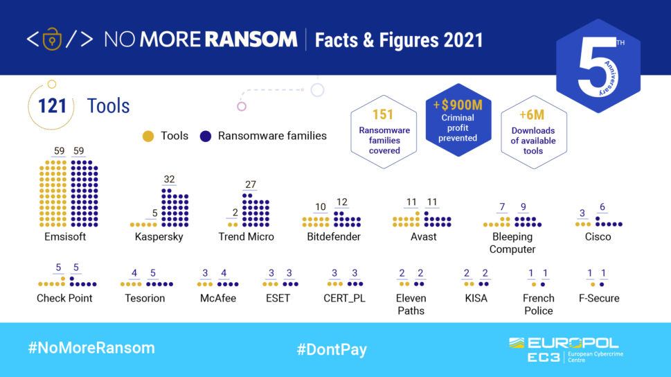 Los desencriptadores disponibles en el repositorio de ‘No More Ransom’ han ayudado a más de seis millones de personas a recuperar sus archivos de forma gratuita. Esto ha evitado que los delincuentes ganen casi 1.000 millones de euros con los ataques de ransomware. Actualmente, el site ofrece 121 herramientas gratuitas capaces de desencriptar 151 familias de ransomware, y reúne a 170 socios del sector público y privado. El portal está disponible en 37 idiomas.