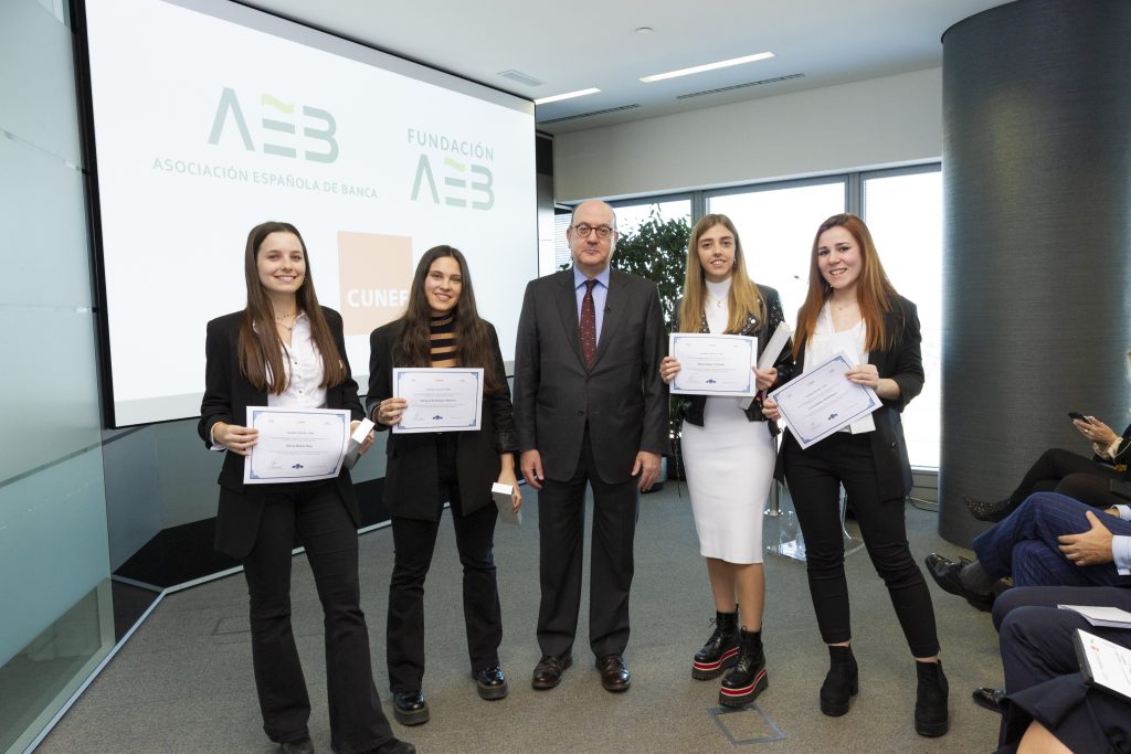 Some 250 CUNEF university students took up the challenge set by the Spanish Banking Association (AEB) and its Foundation to propose projects to improve the level of financial education in Spain, especially among younger people. Of the nearly 60 proposals developed by these students, ten were shortlisted and were presented on 5 March by 40 students at AEB headquarters to executives from various banks and from the Association itself, who served as the jury to choose the winning project.