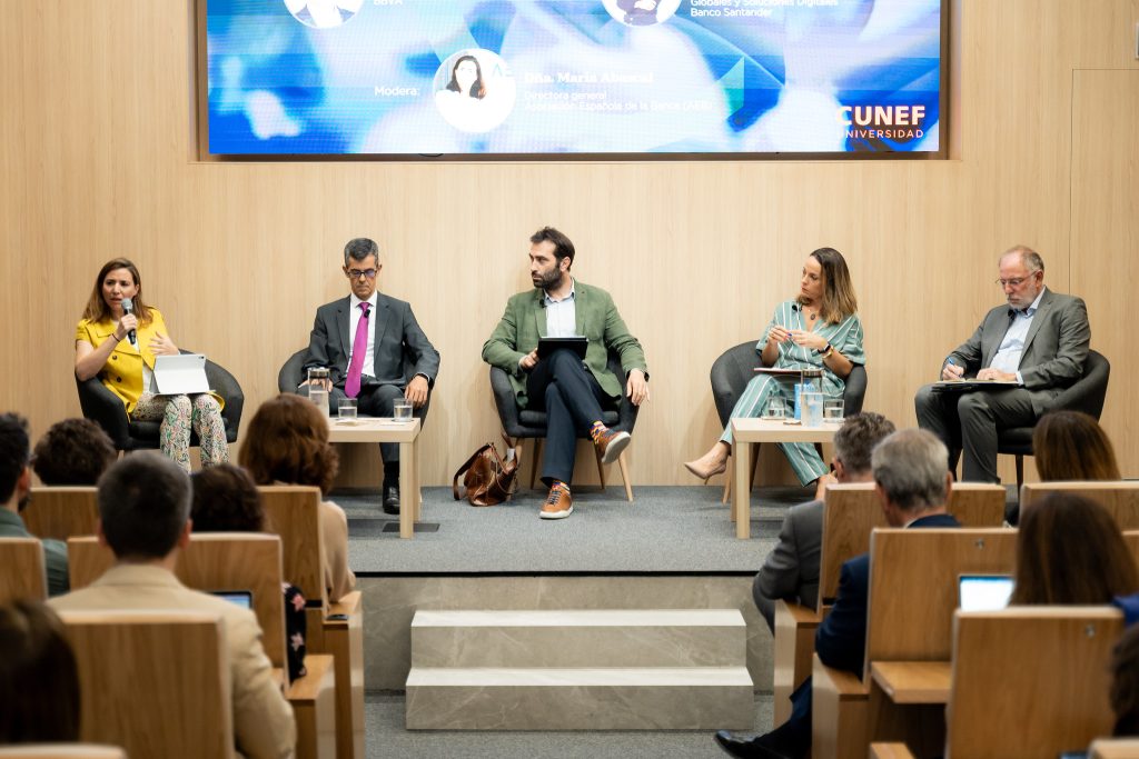The General Director of AEB, María Abascal, moderated the session, which featured the participation of Carlos Cuerpo, Secretary General of the Treasury and International Finance; Juan Ayuso, General Director of Operations, Markets, and Payment Systems at the Bank of Spain; María Ruiz Andújar, Head of Strategy and Business Development for Global Cards and Digital Solutions at Santander; and Santiago Fernández de Lis, Head of Regulation at BBVA.