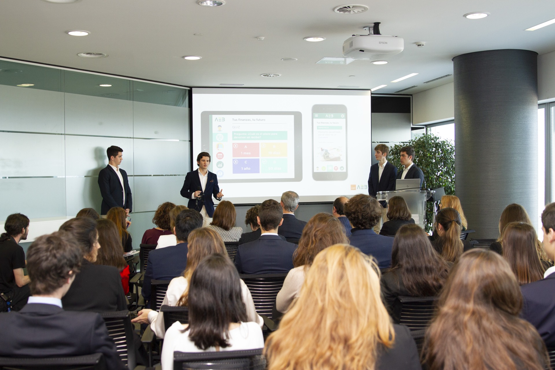 Unos 250 estudiantes universitarios de CUNEF aceptaron el desafío planteado por la Asociación Española de Banca (AEB) y su Fundación de proponer proyectos para mejorar el nivel de educación financiera en España, especialmente de los más jóvenes. De las cerca de 60 propuestas elaboradas por estos alumnos, diez resultaron finalistas y fueron presentadas el pasado 5 de marzo por 40 estudiantes en la sede de la AEB ante directivos de diversos bancos y de la propia Asociación, quienes actuaron como jurados para elegir el proyecto ganador.