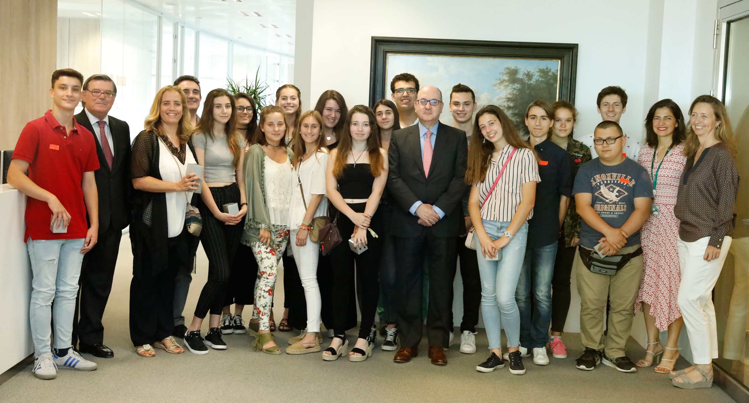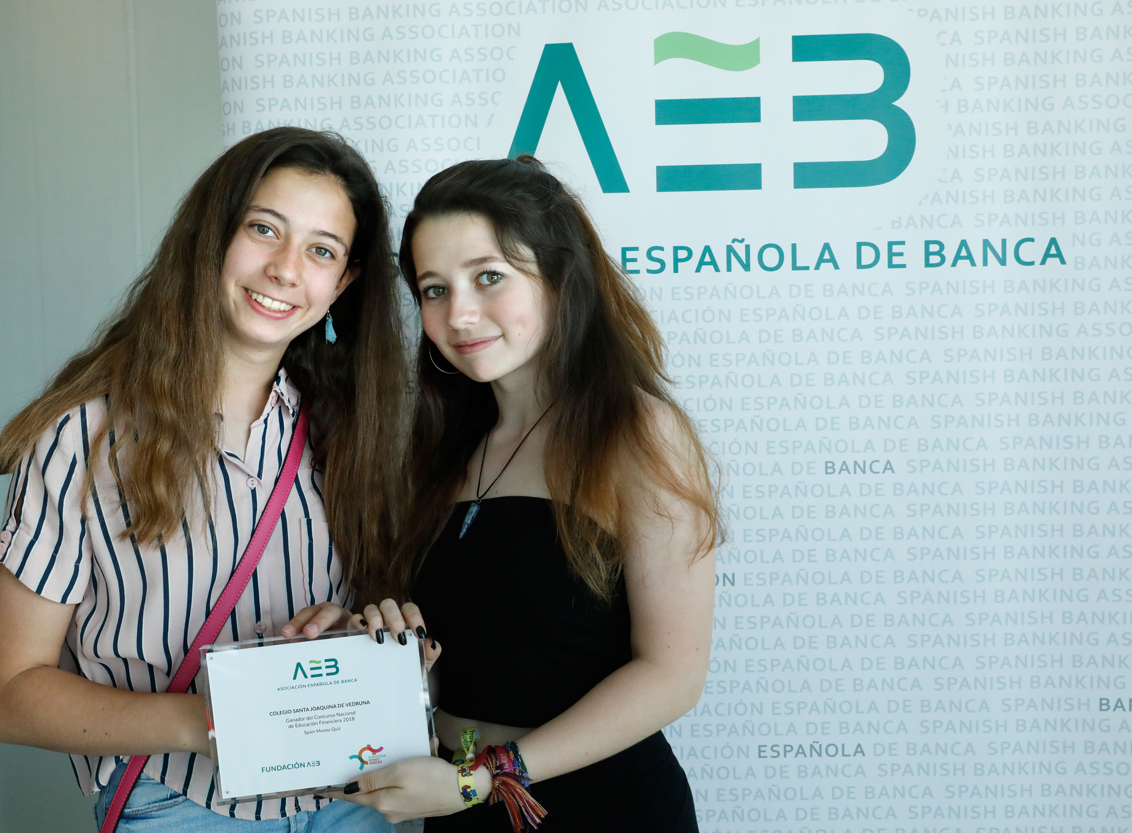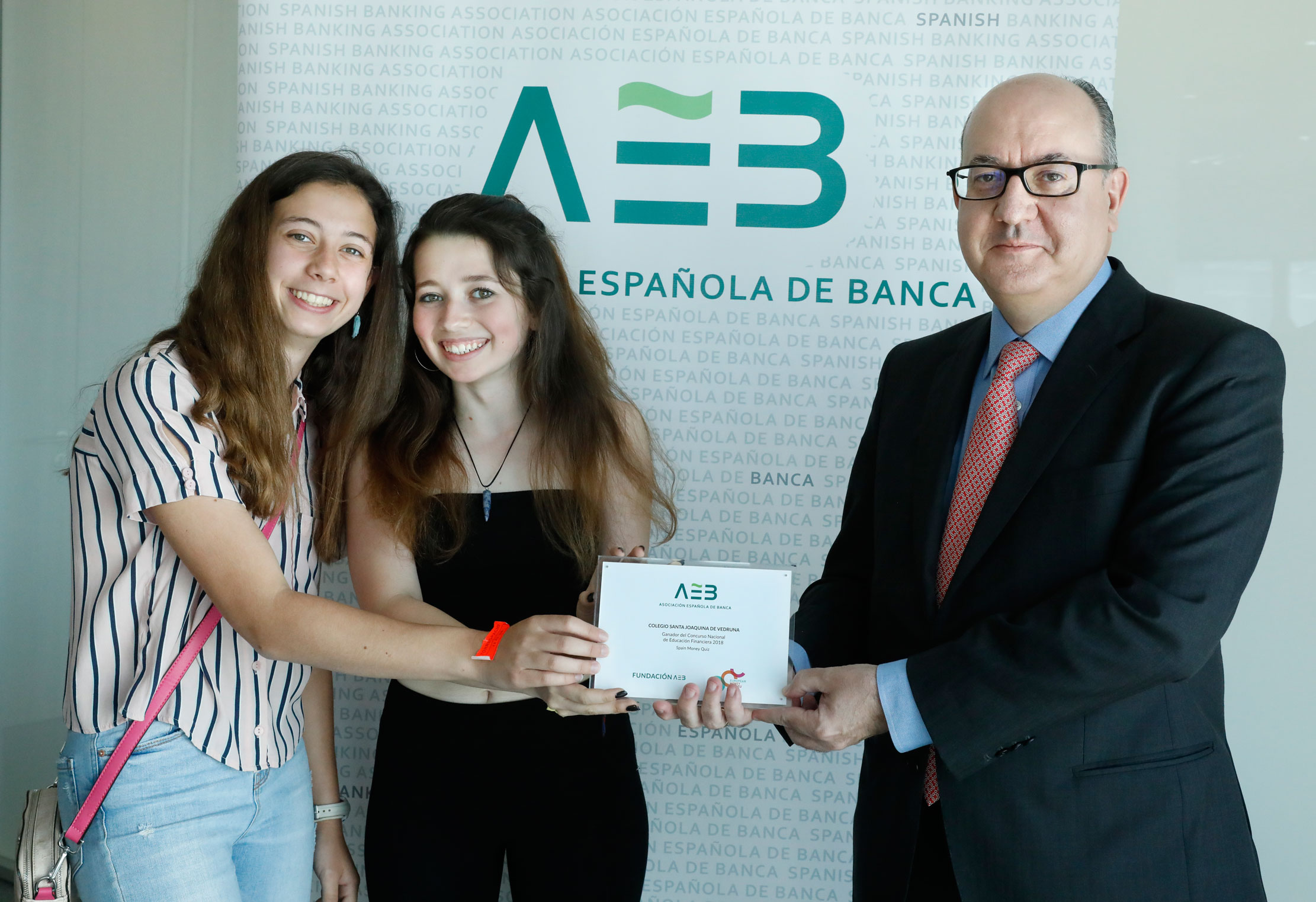 Alumnos del Colegio Santa Joaquina de Vedruna en Madrid recibieron el premio nacional de educación financiera 2018 de manos del presidente de la AEB, José María Roldán, en la sede de la Asociación.